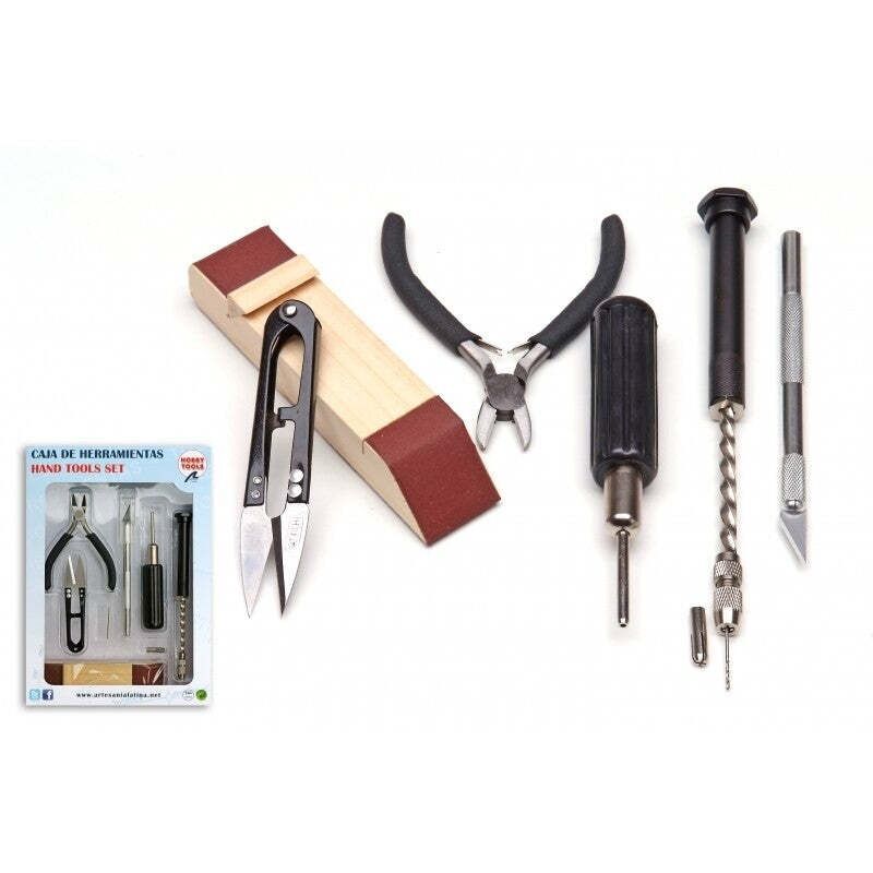 Modeling tools set. The kit of basic modeling tools brings tools to build your ships, planes and trains models easily: includes cutter, tip nailer, hand drill, oblique cutting pliers, thread tweezers and sander dowel. It includes some of the tools that every modeler should have in the initiation phase.