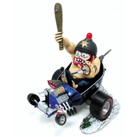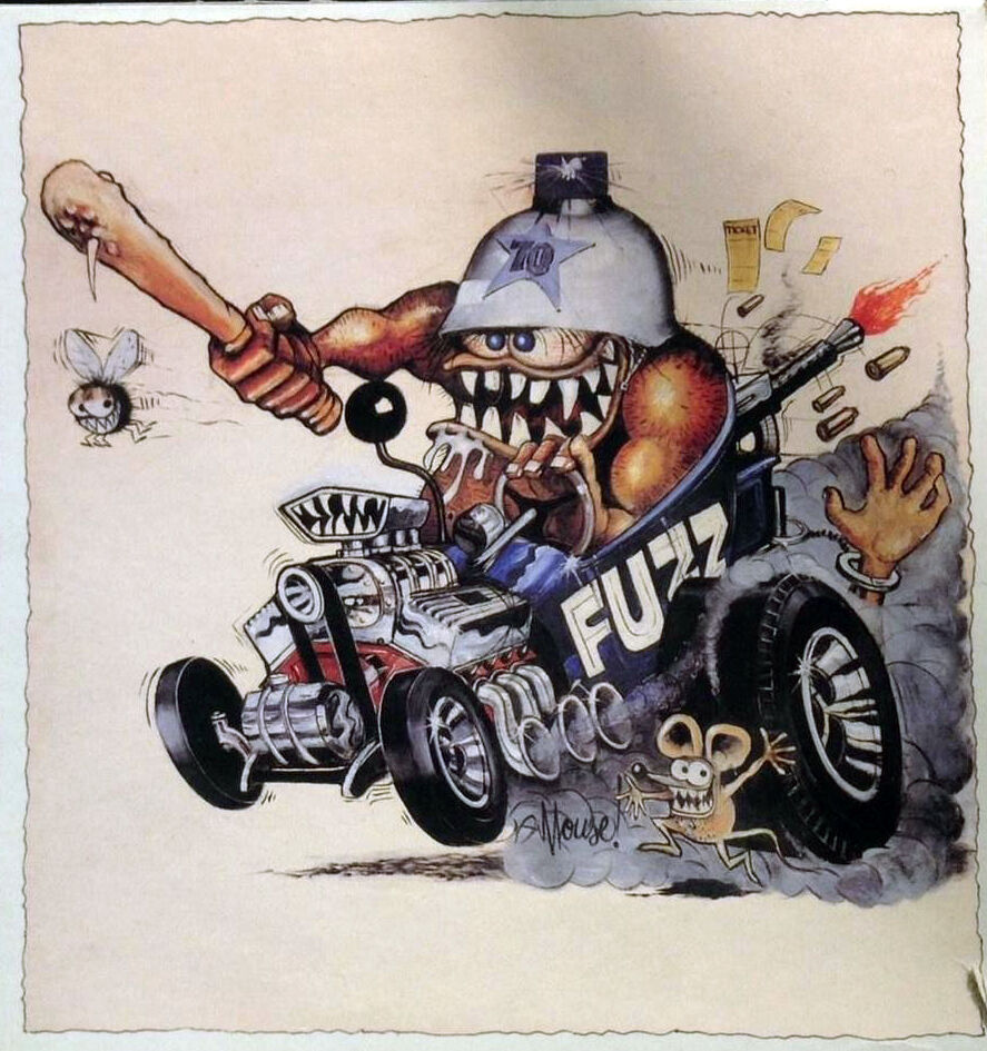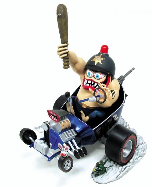 Superfuzz Fred Flypogger himself as a happy friendly lawman. Dig him with his drool in his supercharged prowl car, complete with persuader, machine gun and handcuffed culprit, but still looking for bad guys. This humorous figure stands 6 1/2 inches high with 'gumball machine' helmet, exhaust smoke cloud, and the little signature Mouse up front. Eyes can be positioned anywhere to change expression.