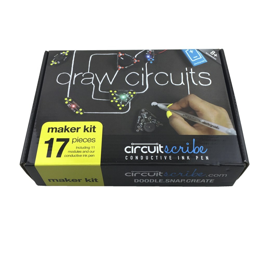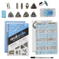 Contains a Circuit Scribe pen, six modules, battery, workbook and accessories to get started. Explore basic circuit concepts like conductivity and work up to creating a touch-sensitive circuit using the NPN transistor. 11pc.