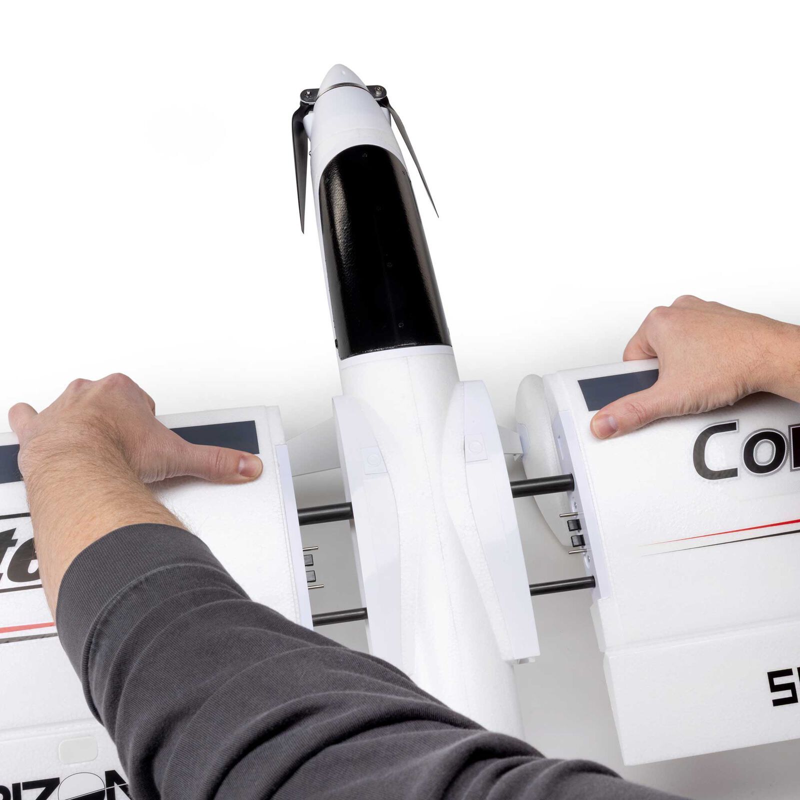 No glue or tools are required for assembly and you can have the Conscendo 2.0m ready to fly in less time than it takes to charge a battery! The two-piece stabilizers simply snap into place, while the two-piece wing with hands-free connections also snaps into or out of place for convenient storage and transport.