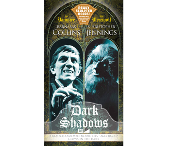 From dark corners of the town of Collinsport come Barnabas Collins and the Werewolf as seen in the classic 1960s TV show ?Dark Shadows?. MPC has opened the vault to bring these highly collectible cult characters back to life. The 1/8-scale plastic figure model kits are now available in a special Dark Shadows Collector?s Edition 2-pack from MPC. The skill level 2 figures assemble to over 8? tall, have jointed arms and legs and are packaged in a collector?s box. The set includes glow-in-the-dark injected plastic parts, a display base and include optional resin heads with highly-detailed character likenesses.