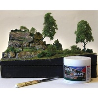 It dries without cracking to a material with great structural integrity bonding wood, plaster, plastic, foam etc. It can be cut, sawn and filed to shape when dry without crumbling like other products and then glued and coloured with acrylic for beautiful scenic effects. Ideal for repairs and special scenic projects where strength and durability is required.