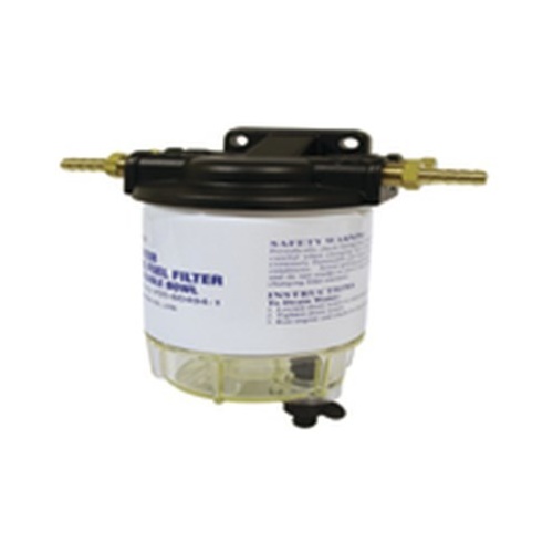 This unit is very similar to the MGC215/225, but uses a different filter element which is open at the bottom and screws into a clear plastic receiver. The receiver tank is clear and you can see any water that has been captured and precipitated from the fuel. A tap enables you to drain this water away. The full system includes fuel filter head with mounting bracket, brass fittings, special water separating fuel filter and clear bowl. It is compatible with most outboards including Mercury and Yamaha. Almost unrestricted fuel flow.