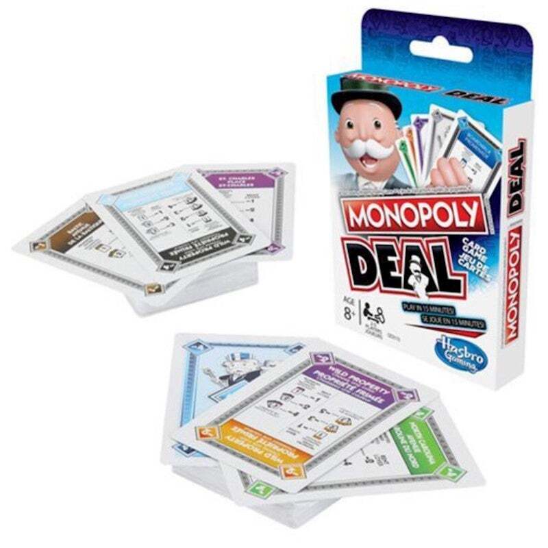 The Monopoly Brand Deal Card Game is all the fun of the Monopoly game in a quick-playing card game. It comes with 110 cards including Property Cards, Rent Cards, House and Hotel Cards, and Wild Property Cards. Action Cards let players do things such as charge rent and make tricky deals. House and Hotel Cards raise rent values. Wild Property Cards help players build Property sets. And, players pay their debts with Money Cards. Be the first player to collect 3 complete Property Card sets in different colors to win. This card game is a great way to play the Fast-Dealing Property Trading Game in as little as 15 minutes!