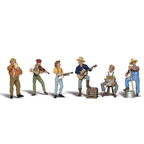 A set of six band members. There’s a guitar player, a jug player, a banjo picker, a washboard strummer, a fiddler and a man strumming a wash tub bass.