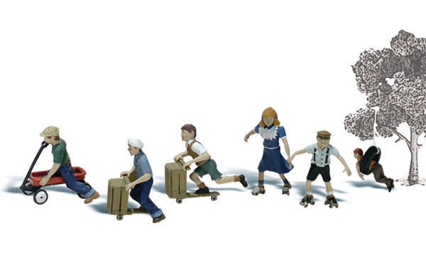 Set Includes one boy in a wagon, two boys on scooters made from old crates, a girl and boy holding hands while they roller skate and a boy in a tire swing.