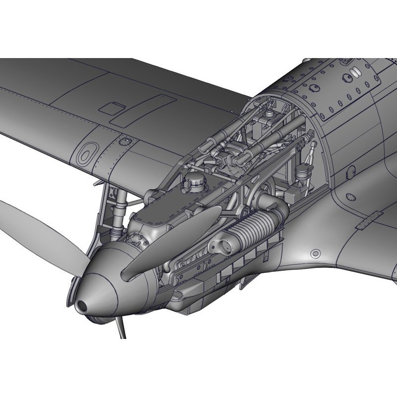 Super-detailed cockpit with 3D decals - Finely detailed engine and nose gun bay - Detailed landing gear with optionals wells covers - PE parts for engine, flaps, cockpit and overall detailing - Realistic panel lines and rivets - Moveable wings and tail ailerons - Open or closed flaps - Two types of tail ailerons - Super decals sheet for 8 versions - Realistic smoke rings decals with application guide - Colored painting and decals guide