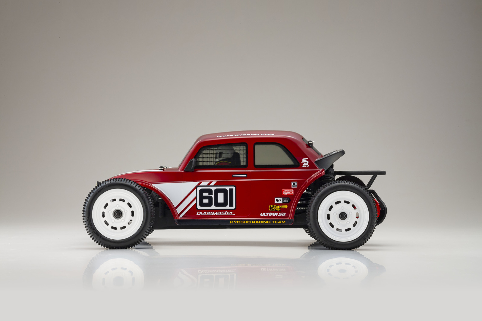Off-road buggies are famous for their ‘go-anywhere’ capabilities and the 1/10 scale EP (electric) format is particularly popular. True to its dirt bashing prowess, Kyosho is proud to introduce the ‘Dune Master’ to the Ultima SB series of mid-class EP buggies. Built on the Ultima SB chassis with rear motor RWD (rear wheel drive) for its superior rear tire traction and maneuvrability, the Dune Master features a new basher body that looks like a modified car rather than the open wheel buggy style. New tire and wheel designs highlight the appeal of the original car body style. Based on the Ultima RB5 chassis which was previously a competition-level racer, each component has been reviewed to deliver superior handling and control for beginners at an optimal price. The rear motor configuration improves rear grip, allowing for traction stability on low-grip surfaces such as sports fields and open terrain as well as delivering high-speed performance on proper R/C race tracks. The new Ultima SB Dune Master and its highly popular Ultima SB Dirt Master predecessor, set the standard for modern mid-class buggies that can be enjoyed by all drivers, either as a step up from entry-level models, or as a second car for experienced drivers.