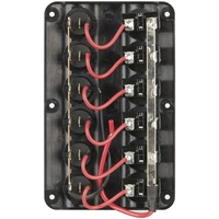 This panel meausres 100 x 160 overall and can be mounted either vertically or horizontally. The circuit breakers are connected in common + by a soldered strip which accepts a 1/4 QC connector. They are then soldered to a 10A rated illuminated rocker switch. The rocker switches have 4.8 QC tabs and are single pole type. The circuit breakers are rated thus: 10A, 8A, 6A and 4A which is quite handy really.