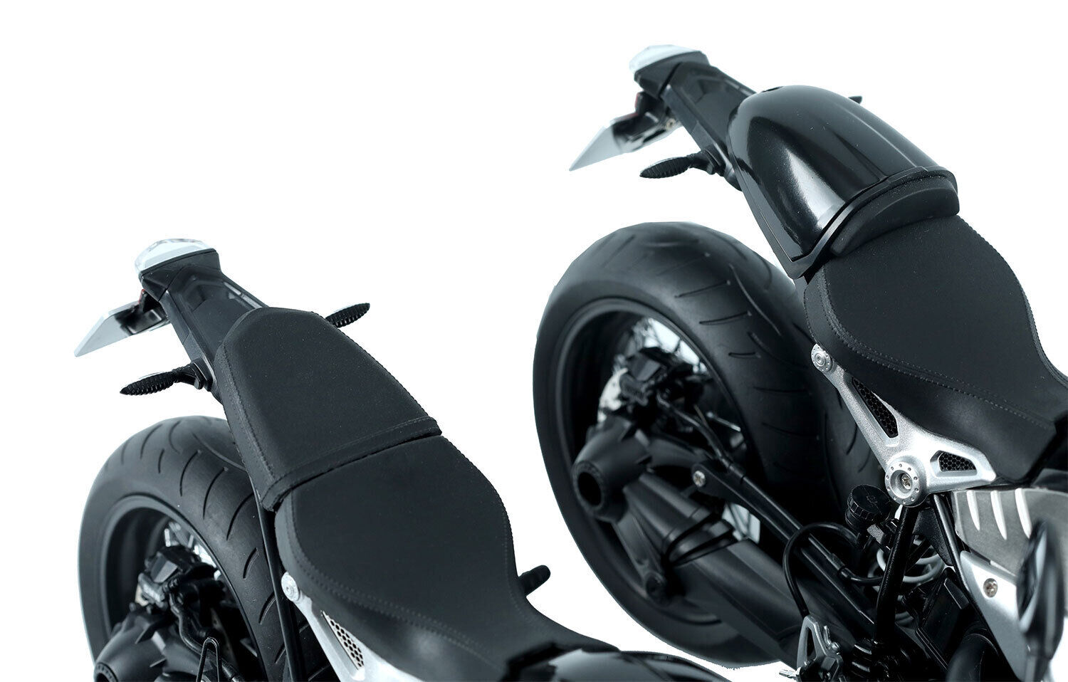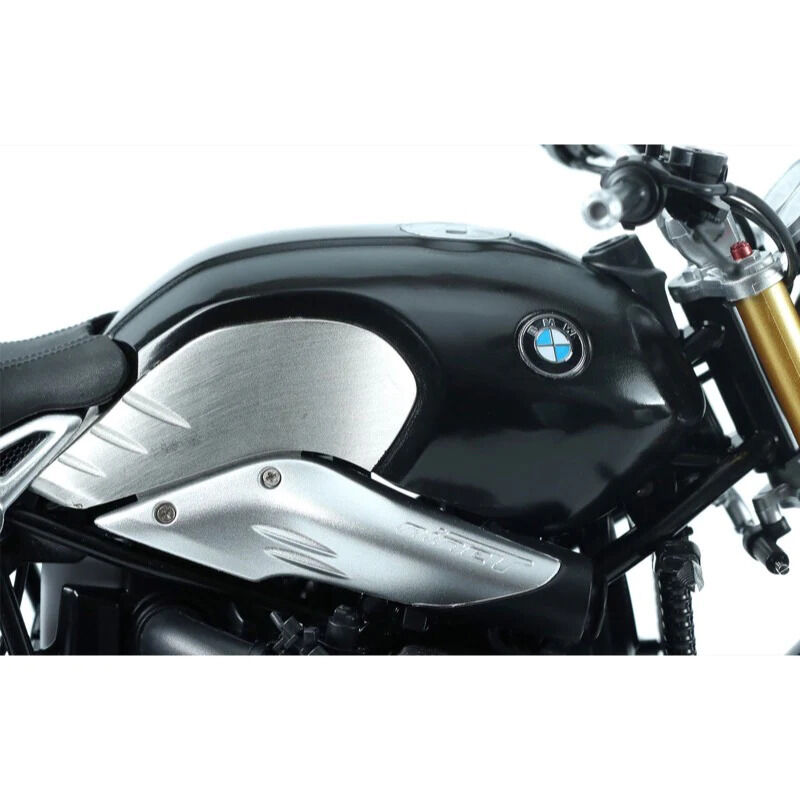 This MENG 1/9 MT-003 BMW R nineT (Pre-colored Edition) is an official licensed model kit. Thanks to its snap-fit design and pre-colored parts, there’s no need to paint the model during the assembly process. Front and rear shock absorbers and the steering damper are movable. Parts like the wheel spokes, headlamp bowl and front section of the exhaust pipe are electroplated. All lights are represented by clear parts. Reflective mirror foil is provided for the rearview mirrors. This kit includes metallic fuel tank, seat hump cover and engine cylinder, and vinyl seats and backrest, and stainless steel PE parts and pre-colored PE parts. This model can be built as a single seat or double seat version.