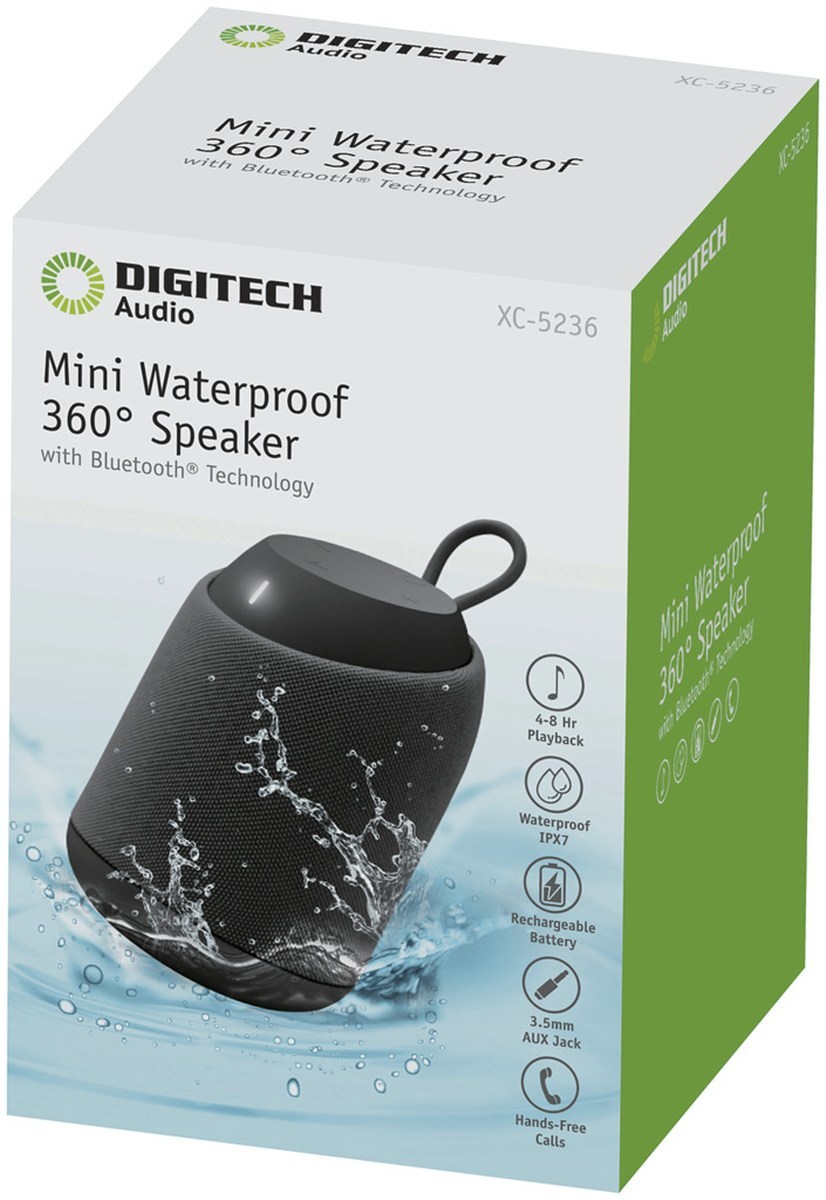 This mini waterproof speaker with Bluetooth® Wireless Technology has a full 360° projected sound so nobody misses out on the party! Features a 3.5mm audio jack to run a direct audio cable and a microphone so you can take calls through the speaker. Runs up to 8 hours on the internal rechargeable battery. Perfect for the beach, camping, boating or by the pool. Includes 3.5mm to 3.5mm auxiliary and USB charging cables.