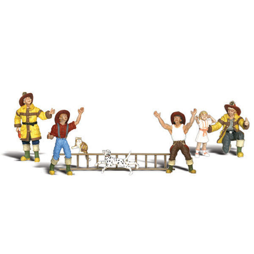 A set of four firemen, a little girl, a dog, cat and a ladder. One fireman is caring for the little girl, one fireman is signaling above his head, one fireman is standing, looking up at another fireman on a ladder who is rescuing a cat from a tree.