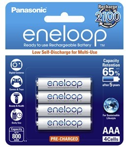 This range of Panasonic eneloop batteries have numerous advantages over regular rechargeables. Key characteristics include low self-discharge, they are pre-charged so can be used right out of the packet, and can be recharged up to 1800 times. After 5 years of storage they will retain up to 70% of their capacity once fully charged. A far more environmentally friendly option than churning through dozens of alkalines.