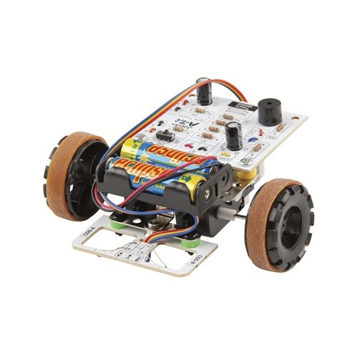 An educational introduction to the world of robotics and programming. Assemble the kit and you are able to use it in two main ways, programming mode or line tracing mode. With the supplied software you are able to program instructions into the robot to navigate its way across the floor. In line tracing mode, simply draw a line on some paper with a thick black marker and the robot will follow the course. It accomplishes this with two optical sensors, somewhat similar to a common garden bug.