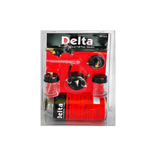 DL 81003 Airbrush with Propellant Set. The Delta 81003 Airbrush and propellant set contains everything needed to provide an ideal introduction to airbrushing. Includes a Precision Airbrush with adjustable needle R134a Ozone Friendly Propellant (250 gm) Adjustable Pressure Air Regulator Cap for Propellant Air Hose Pipette Spare 22 ml Glass Jar Instructions For Use