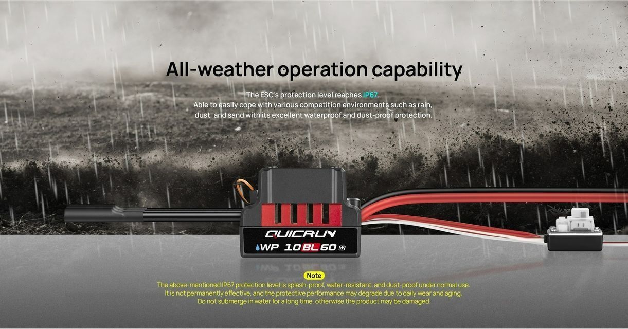 Introducing the enhanced QUICRUN WP-10BL60 G2 ESC, one of the most value-packed ESCs in the series. Designed for 10th-scale sensorless brushless setups on 2-3S LiPo batteries, it now offers all-weather operation in a more compact size. Built-in tuning capabilities and compatibility with the HOBBYWING LED program card, LCD Program Box Pro G3, or OTA enhance its flexibility, making it the ultimate upgrade ESC choice.
