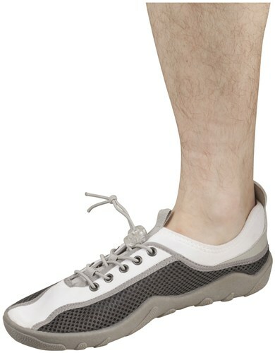 They are slip-on, slip-off self-draining, with no-knot lacing. Very soft rubber sole, grey-white.
