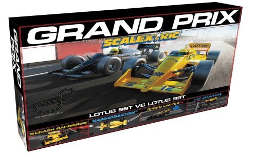 Two iconic Lotus Formula One cars of the 1980s go head-to-head in this fantastic new retro set from Scalextric! The sleek black Lotus 98T of the world-famous Ayrton Senna goes head-to-head with his amazing yellow 99T as they fight for position around the circuit, with Turbos chattering and wastegates fluttering these famous Grand Prix racers are sure to light up your circuit! This set contains everything you need to race Scalextric, including two cars, power, over 5.3 metres of track including a lap counter, 2 easy speed limiting hand controllers and crash barriers.