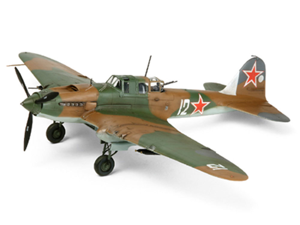 The Ilyushin IL-2 Shturmovik was the Russian military's main ground-attack aircraft during WWII, with over 36,000 examples built by the end of the war. Production of the single-seat version of the IL-2 began in March 1941 but severe losses led to the development of a two-seat version with a rear gunner. A version which featured outer wing sections swept back at 15-degrees for a better center of gravity was introduced in late-1943. Together with the T-34 tank, the Il-2 contributed greatly to the eventual Russian victory.