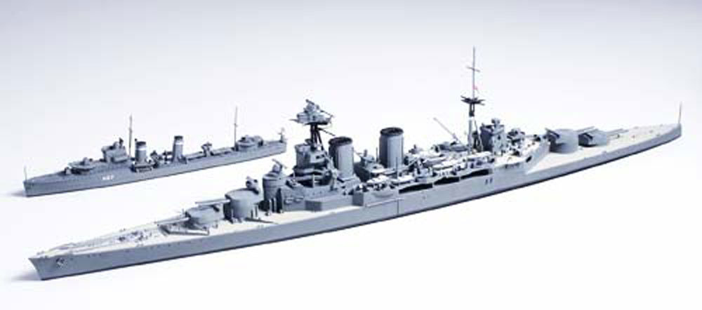 Highly detailed 1/700 scale model of the British battle cruiser Hood and E Class destroyer.