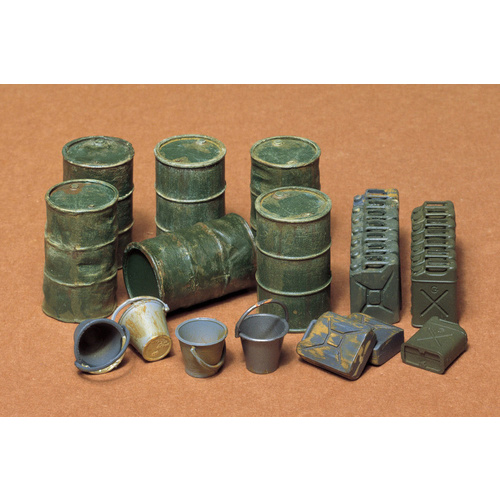 Pieces include six drum cans, nine German jerry cans, four buckets, and nine U.S. jerry cans.