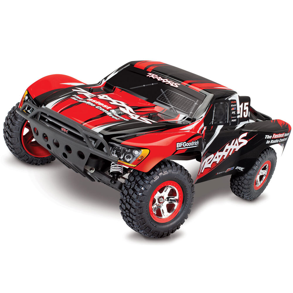 The award-winning Traxxas Slash short-course race truck puts you in the driver’s seat for intense fender-to-fender, high-flying off-road action. Full-scale short-course race trucks embody the spirit of Traxxas RC with their extreme 900+ horsepower racing engines full-throttle, dirt-roosting power slides, giant suspension travel, and big-air jumps. The Traxxas Slash brings all the action home so you can experience the high-speed head-to-head competition at the track or in your own backyard. The rear-wheel drive Slash is purpose built to fly over jumps and rip full-throttle through the turns. Slash hangs it out for an all new way to challenge your driving skills. The 4-wheel independent suspension has been carefully tuned to replicate the real world driving and handling experience as closely as possible. The scale appearing tires provide just the right amount of bite and thick, blinding clouds of dirt roost.