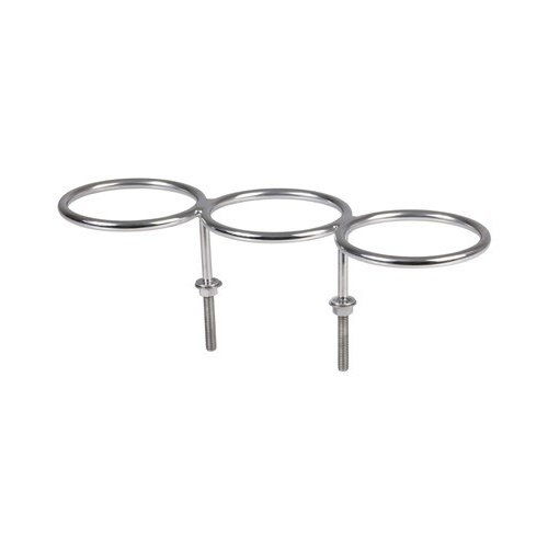 These beautiful hand-made triple drink holders are for permanent fixing, particularly in boats, RV’s and caravans. They enable you to hold a wine bottle or a stubby (with cooler) in place in problematic environments. They are fixed in place by threaded (8mm) mounting studs. (You really need blind-side access or you could epoxy them in place.) They represent a permanent commitment to beverage security!