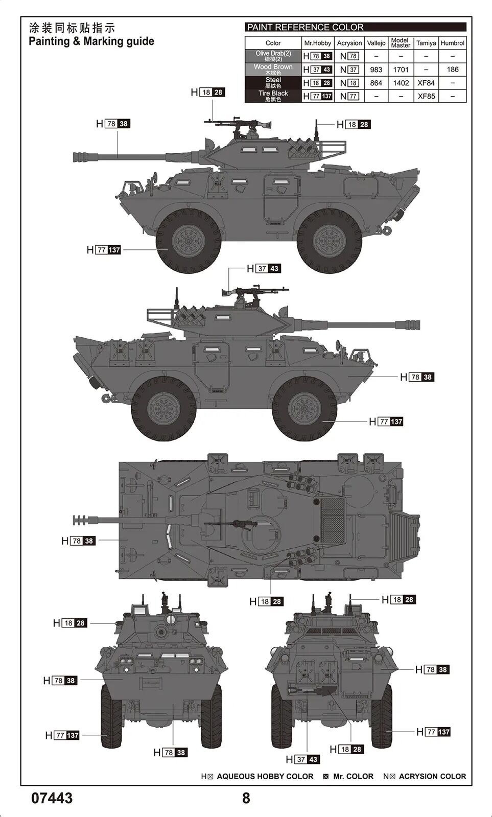 The V-150 "Commando" 4x4 wheeled armored vehicle boasts excellent off-road capabilities, reaching a top speed of 113 km/h on roads. Its watertight hull makes it fully amphibious, allowing it to float or wade without preparation. The V-150 series offers 16 variants, including command, maintenance, mortar, TOW missile launcher, air defense, and armored personnel carriers. It can be equipped with a variety of weapon stations, including most light and medium automatic weapons, missile systems, mortars, and a 90mm cannon.