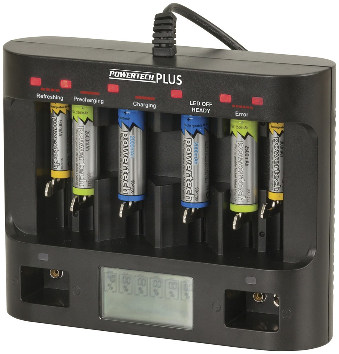 MB3555 This is a powerful, yet flexible, fast charger for all those standard (AA/AAA/C/D) rechargeable cells (Ni-MH or Ni-Cd), up to 6 at a time, including 2 exclusive slots for 9V rechargeable batteries. Up to 1A charging per cell (depending on size) means typical AA cells will only take a couple of hours to charge. Feedback on charging status is provided thanks to an informative LCD panel and status lights. It also provides a convenient 1A USB outlet, so you can charge your smartphone, tablet or any other USB powered device. This unit does not charge rechargeable Lithium or Alkaline cells.Features:- Quick charge- USB output- Intuitive LCD display- LED indicators (various modes)Specifications:Input Voltage: 100-240VAC @ 450mA, 50/60 HzCharging Output:  AA: 6 x 1.2V @ 1000mA                  6 x 1.2V @ 500mA / USB AAA: 6 x 1.2V @ 500 mA 6 x 1.2V @ 250 mA / USB   C / D: 4 x 1.2V @ 1000mA  4 x 1.2V @ 500mA / USB  9V: 2 x 9V @ 70mA 2 x 9V @ 35mA  / USBUSB Output: 5VDC @ 1A Dimensions: 180(W) x 144(D) x 55(H)mm