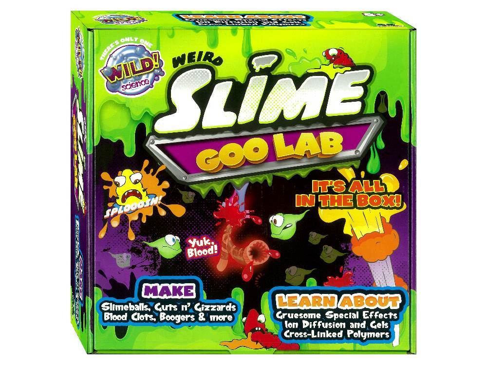 Weird Slime Goo Lab. Master polymer reactions to make drippy and bouncy slimes and gels. Create Tadpole and Leech soup, Rat Guts Noodles, Jellyfish, Blood Clots and more. Workbench and tools included. Does not use Toxic and Illegal Borax. Age Grading: 8+ Years