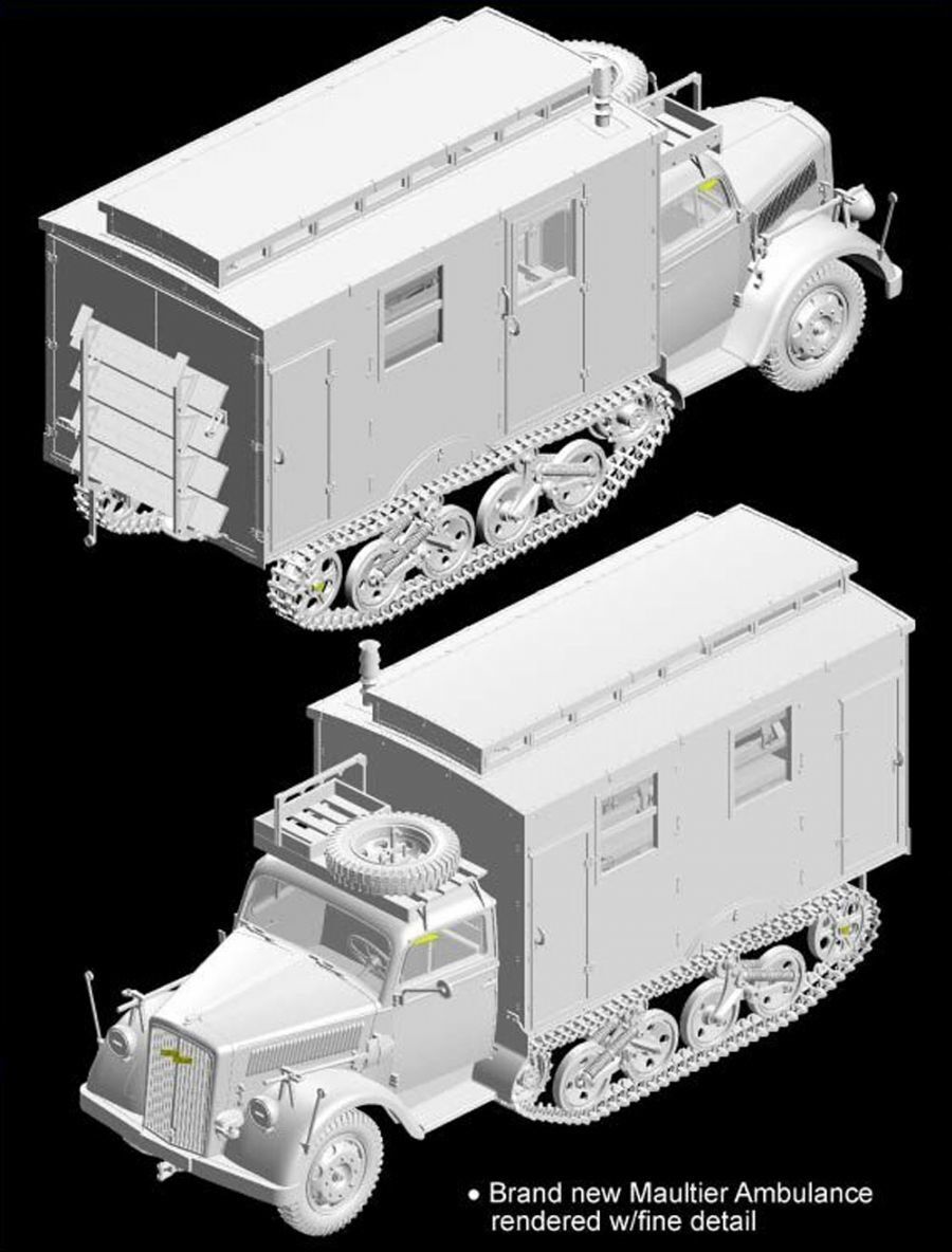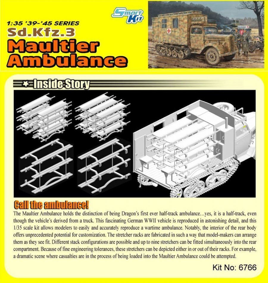 The 7.1-tonne Maultier, introduced from 1942 onwards, was largely successful although it wasn...t quite as mobile as purpose-built halftracks. One interesting variant was a Maultier Ambulance that could be used for battlefield evacuation. Dragon is proud to be the first manufacturer to offer a plastic kit of this unique vehicle!