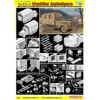 This stunning 1/35 scale kit, fully living up to the standards expected by current-generation modelers, is based on Dragon...s existing Maultier. The rear ambulance body is completely new, including a delicate access ladder on the rear, as well as side doors and an associated footstep. The rear door opens to reveal a completely outfitted ambulance interior, one that has been carefully recreated with details as accurate as possible using wartime photos as a reference.