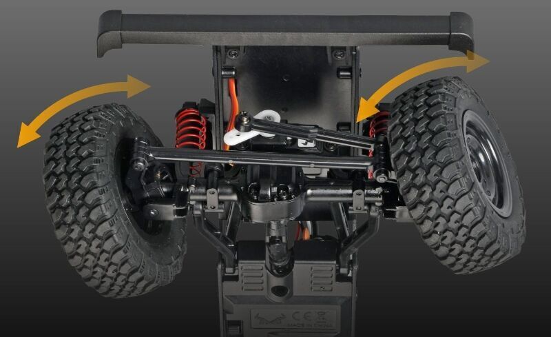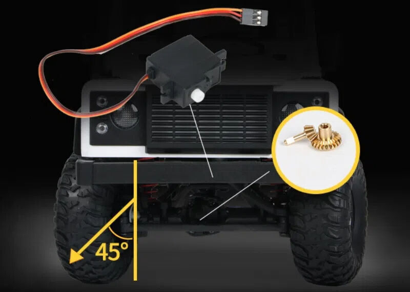 MN MODEL MN99S comes with a built-in 7.4V lithium battery boasting a capacity of 2500mAh, ensuring robust endurance for extended operation. This car utilizes a professional metal chassis featuring an upgraded steering system driven by a steering engine to  achieve a 45° steering torque angle using durable metal gears.